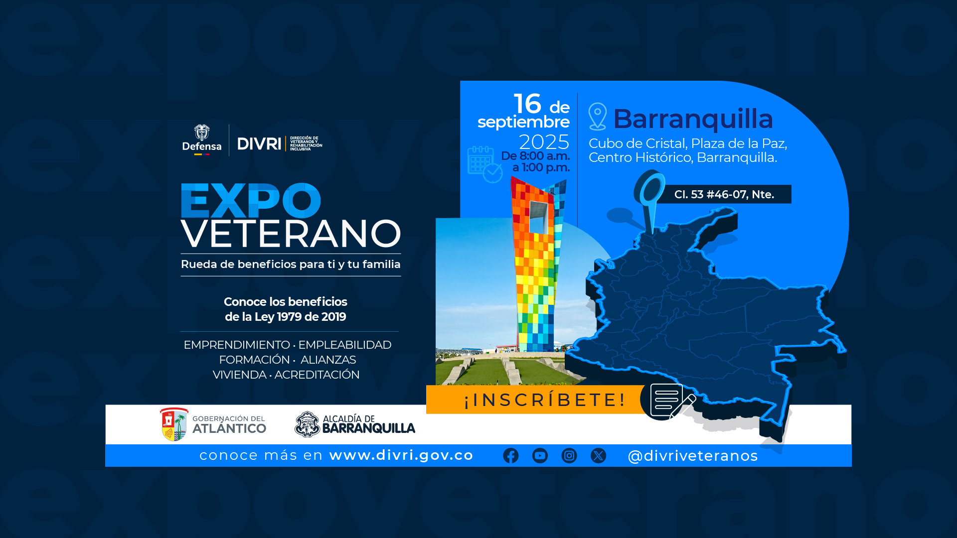 La jornada se llevará a cabo en el Cubo de Cristal (Plaza para la Paz), calle 53 #46-07, Norte – Centro Histórico, desde las 8:00 a.m. hasta la 1:00 p.m., y es organizada por la Dirección de Veteranos y Rehabilitación Inclusiva (DIVRI) del Ministerio de Defensa Nacional.
