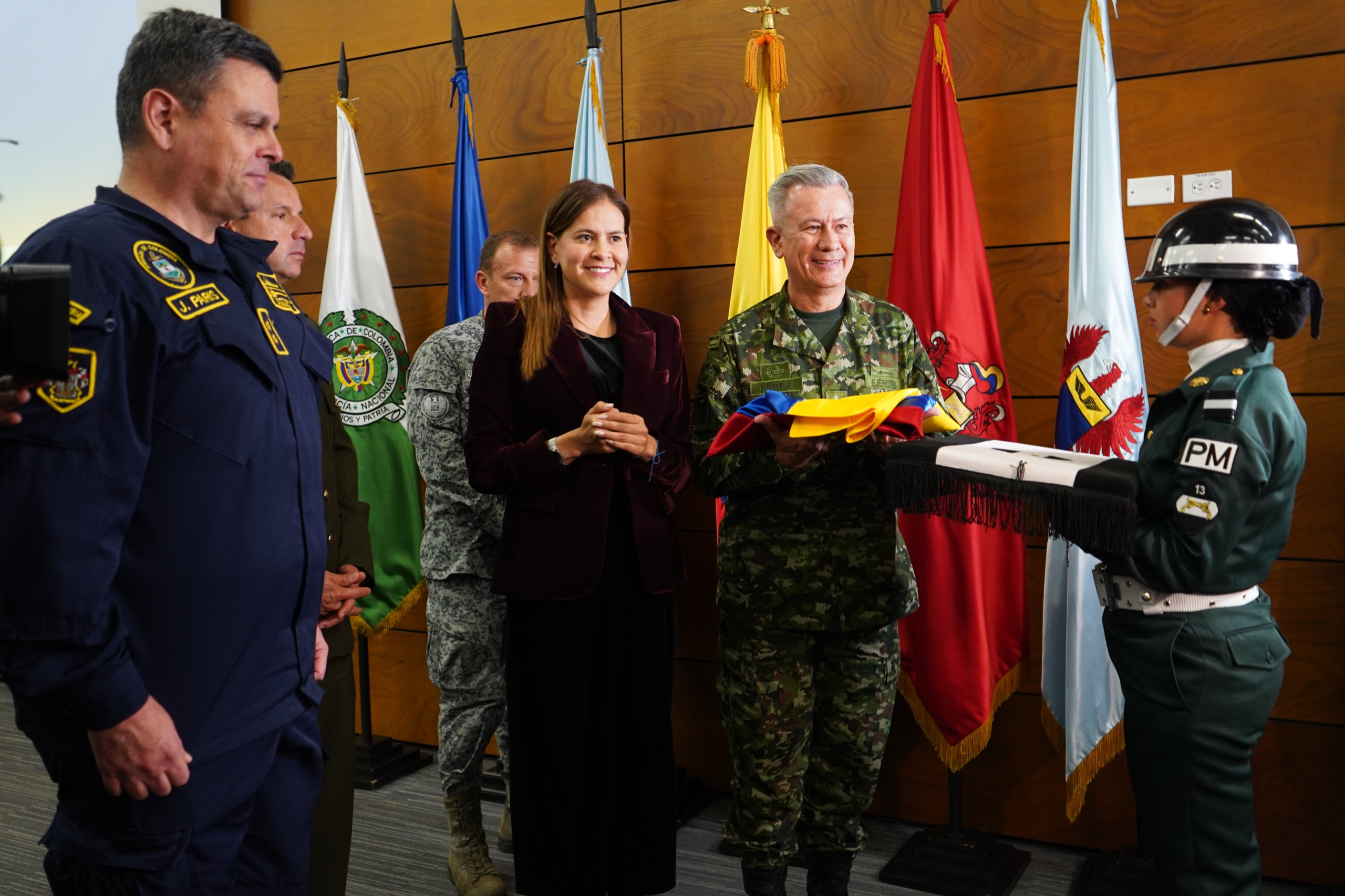 La viceministra de Veteranos y el GSED, Ana Catalina Cano Londoño, durante la entrega de la bandera de Colombia.