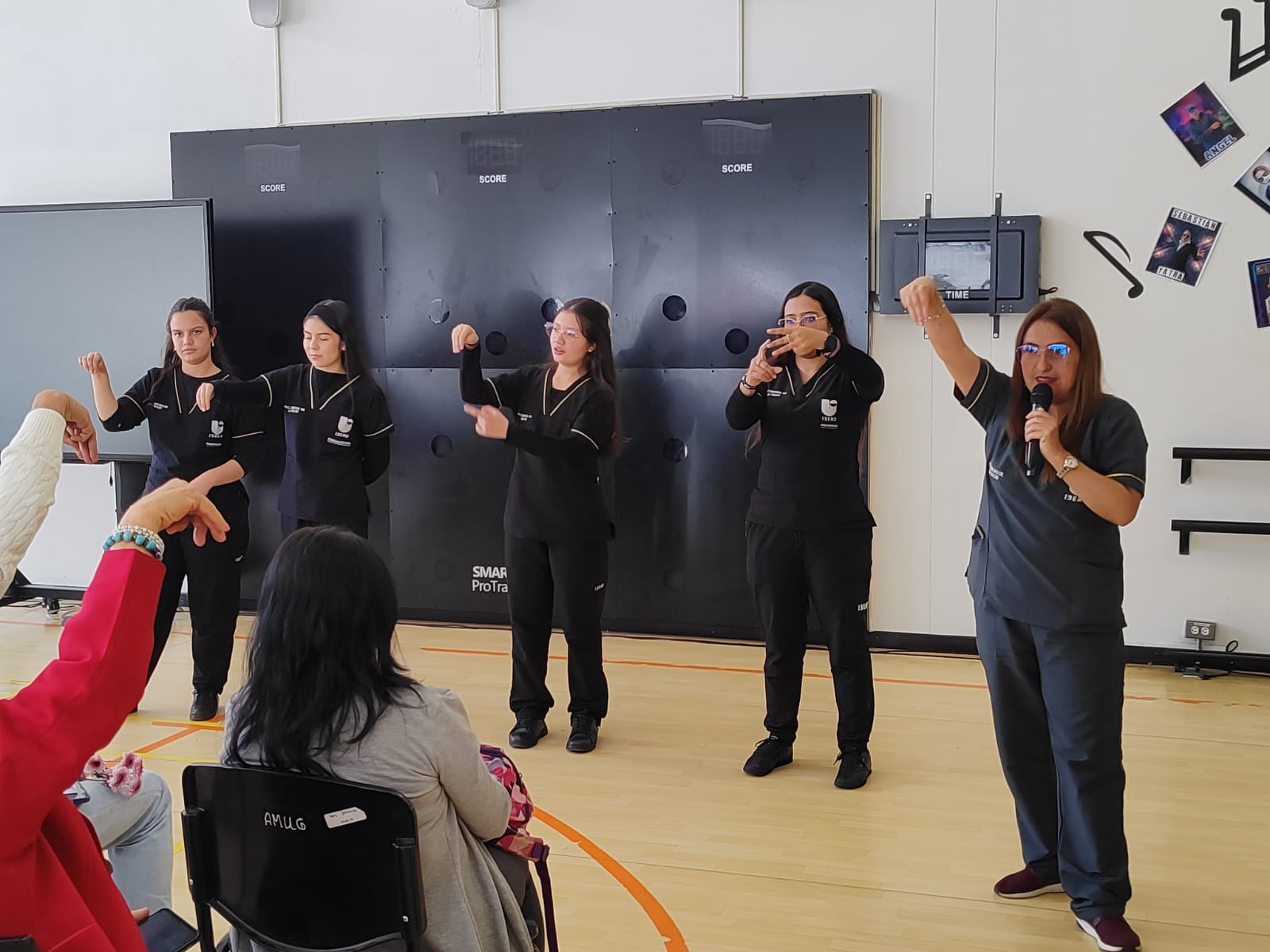 Docentes y estudiantes de la Universidad Iberoamericana explicando la lengua de señas.
