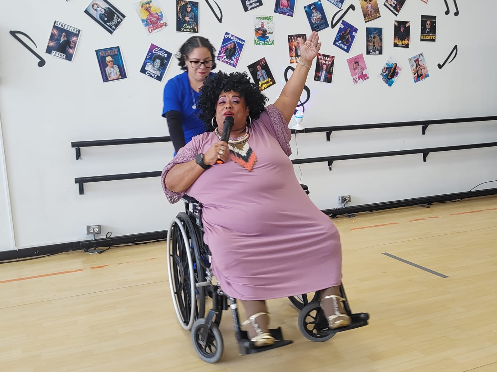 La beneficiaria de la Fuerza Pública, Luz Estela Merchán, durante su show interpretando a Celia Cruz, en el proyecto A mi modo, donde otras 33 personas con discapacidad imitaron a su artista o cantante favorito.