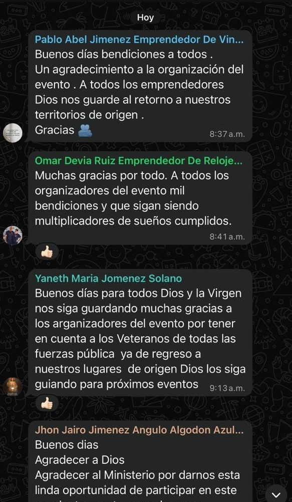 "Buenos días para todos, Dios y la Virgen nos siga guardando. Muchas graicas a los organizadores del evento por tener en cuenta a los veteranos de toda la Fuerza Pública. Ya de regreso a nuestros lugares de origen".